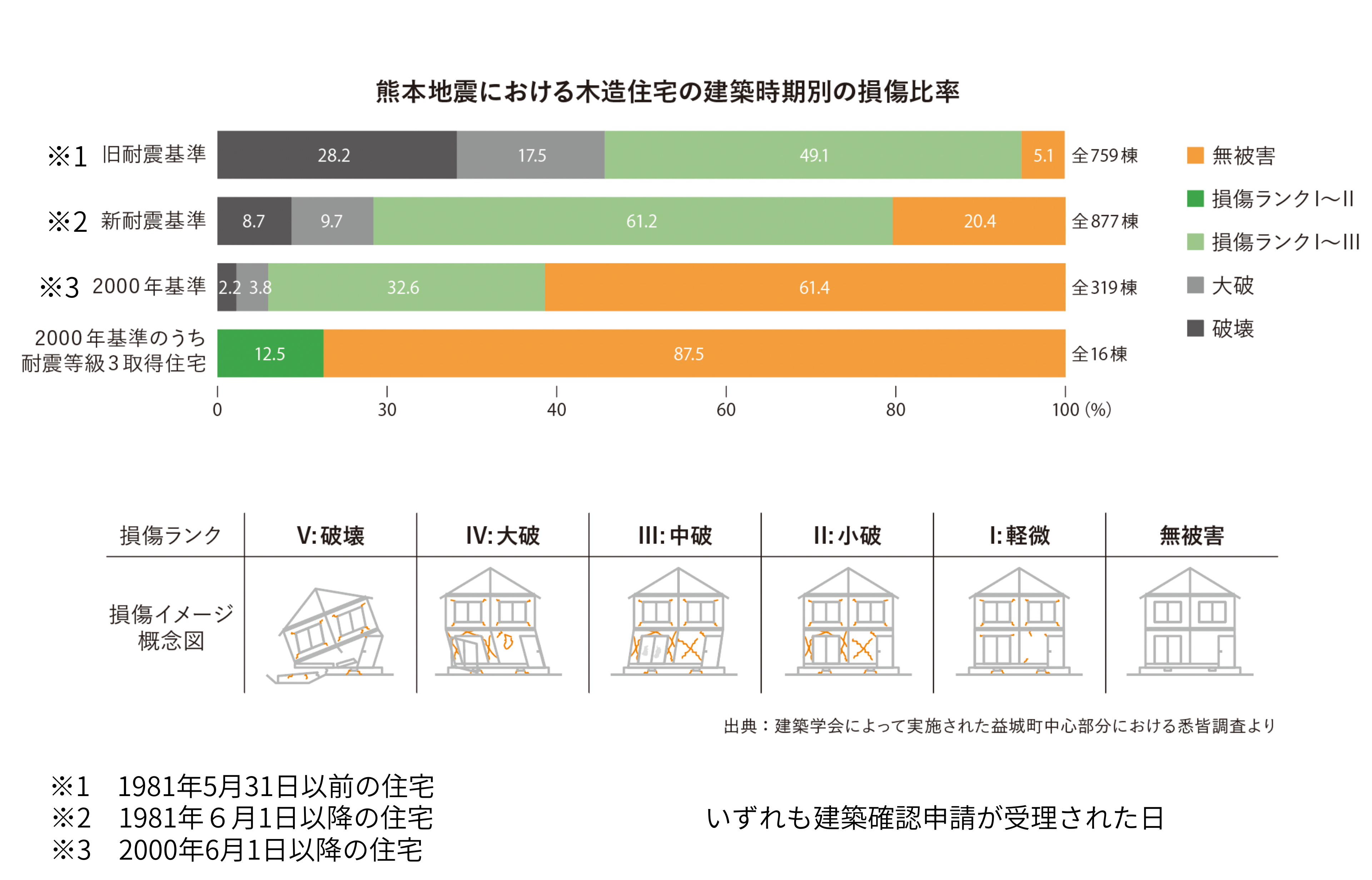 旧耐震基準(1981年以前)の住宅は大破・倒壊が多く、